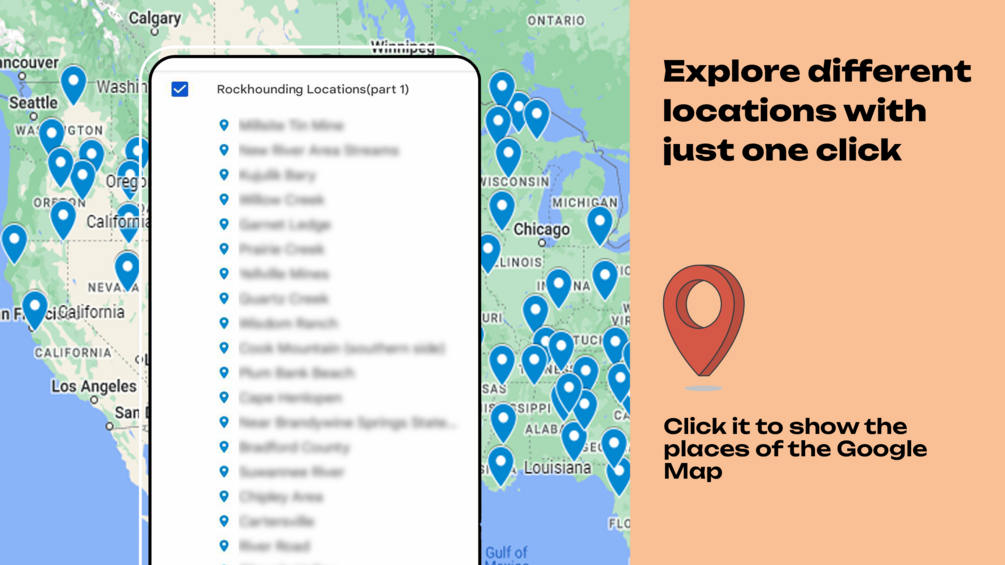 • Google Maps Pins: Detailed locations of rockhounding sites across various states.