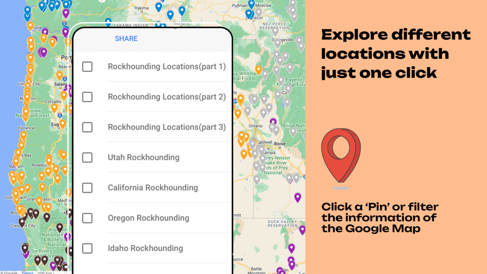 - Google Maps Pins: Detailed locations of rockhounding sites across various states.